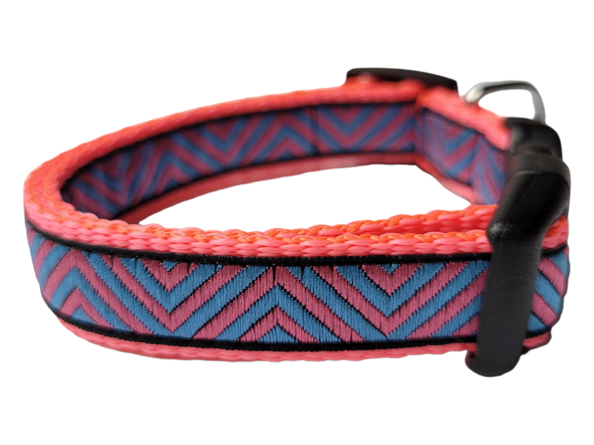 De halsbandjes zijn 15mm breed en verstelbaar van circa 22-35cm in maat M. De halsbandjes zijn gemaakt van stevig maar zacht band met een geweven printje wat deze halsband erg duurzaam en slijtvast maakt.