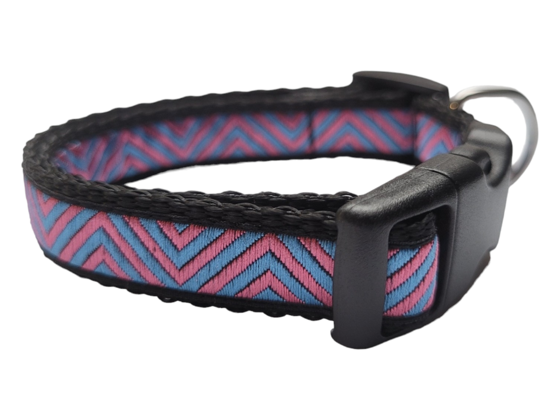 De halsbandjes zijn 15mm breed en verstelbaar van circa 22-35cm in maat M. De halsbandjes zijn gemaakt van stevig maar zacht band met een geweven printje wat deze halsband erg duurzaam en slijtvast maakt.