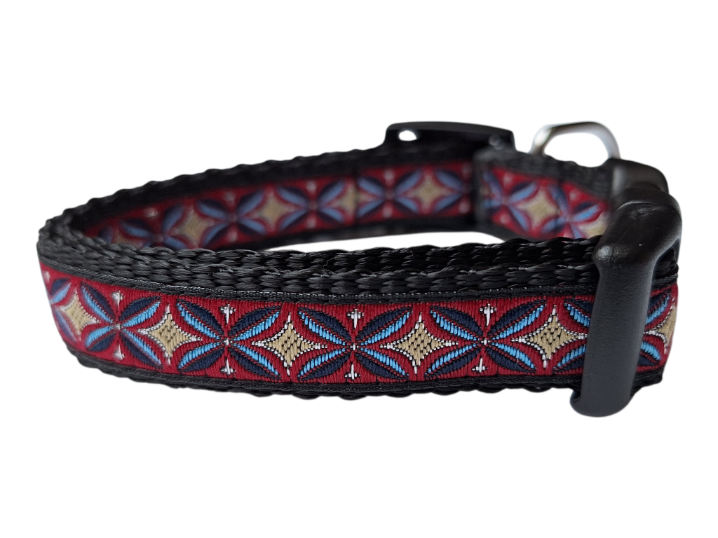 De halsbandjes zijn 15mm breed en verstelbaar van circa 22-35cm in maat M. De halsbandjes zijn gemaakt van stevig maar zacht band met een geweven printje wat deze halsband erg duurzaam en slijtvast maakt.