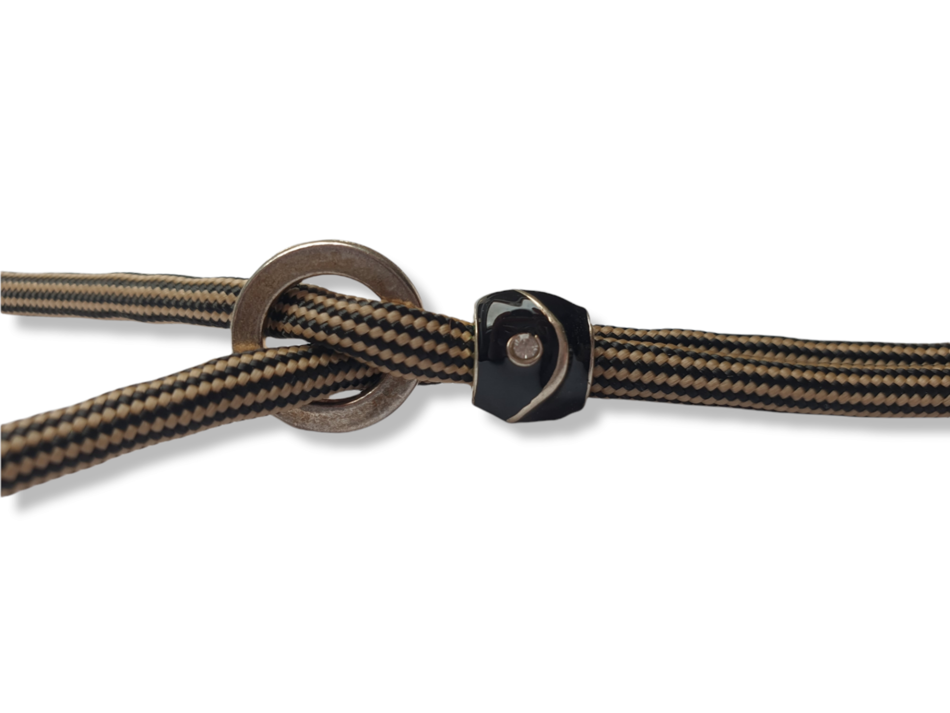 Het ringetje sluit aan in de nek en de kraal voorkomt dat de lijn open schuift.