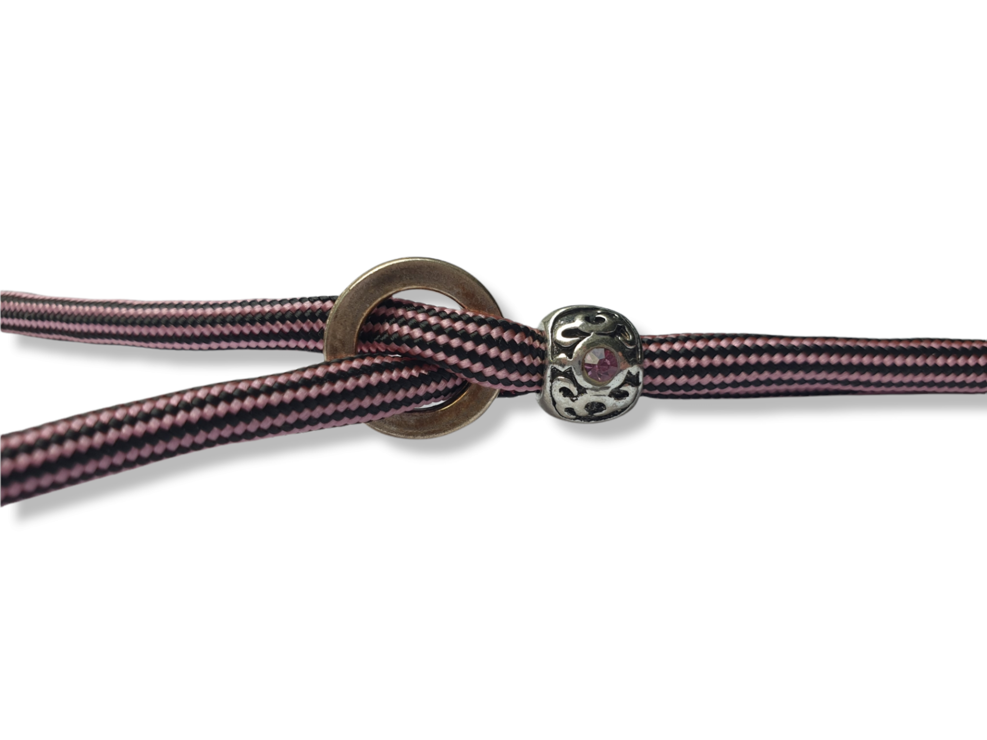 Het ringetje sluit aan in de nek en de kraal voorkomt dat de lijn open schuift.