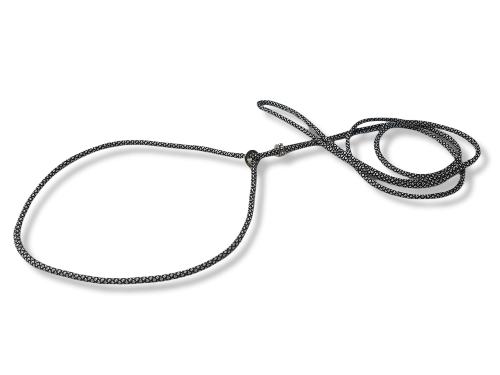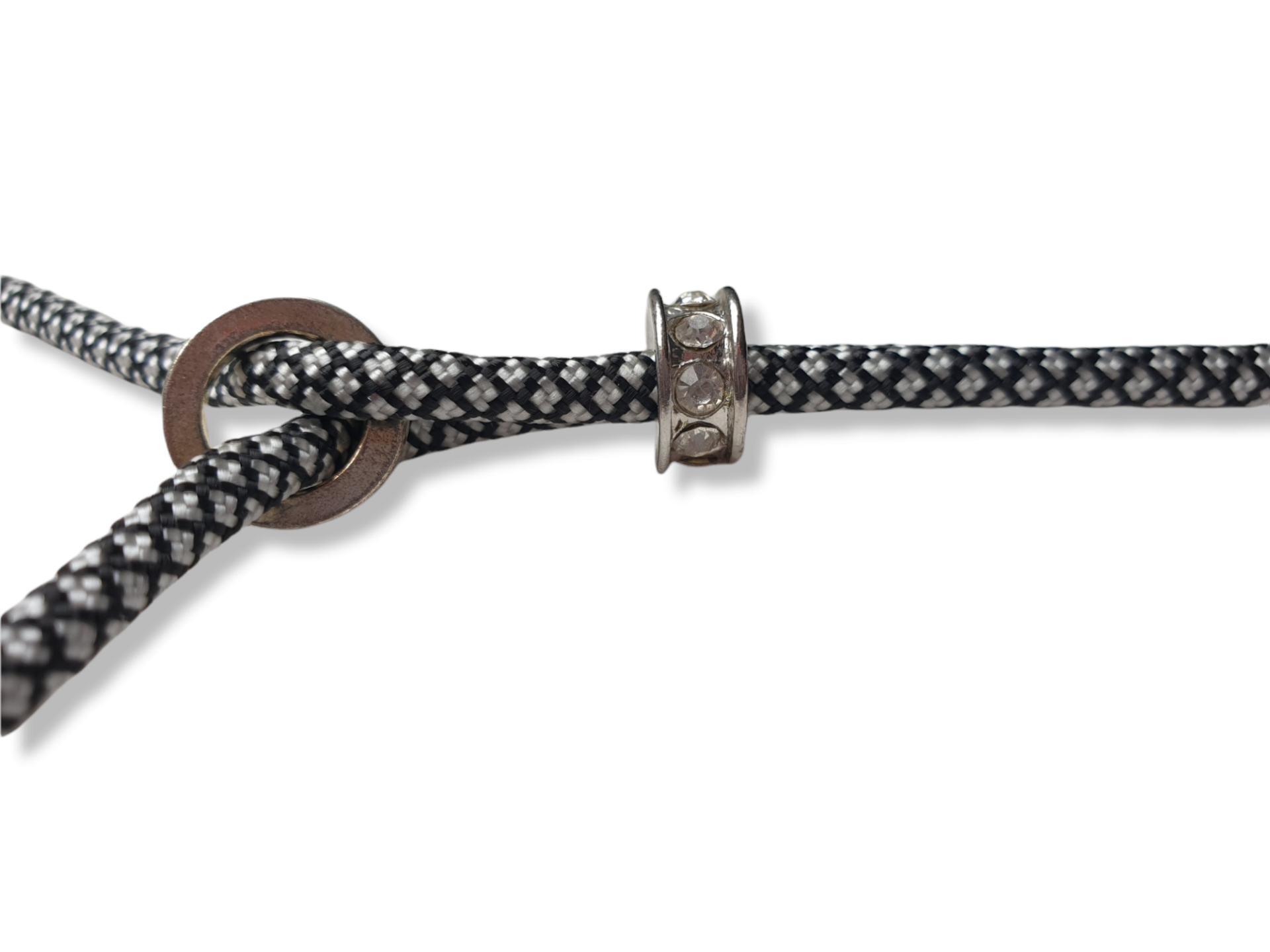 Het ringetje sluit aan in de nek en de kraal voorkomt dat de lijn open schuift.