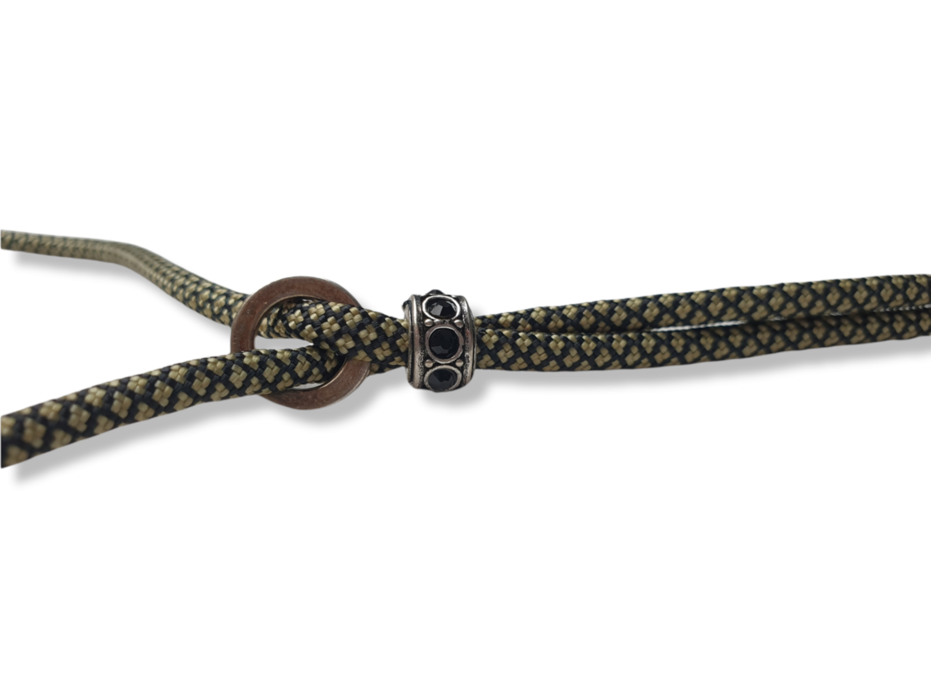 Het ringetje sluit aan in de nek en de kraal voorkomt dat de lijn open schuift.