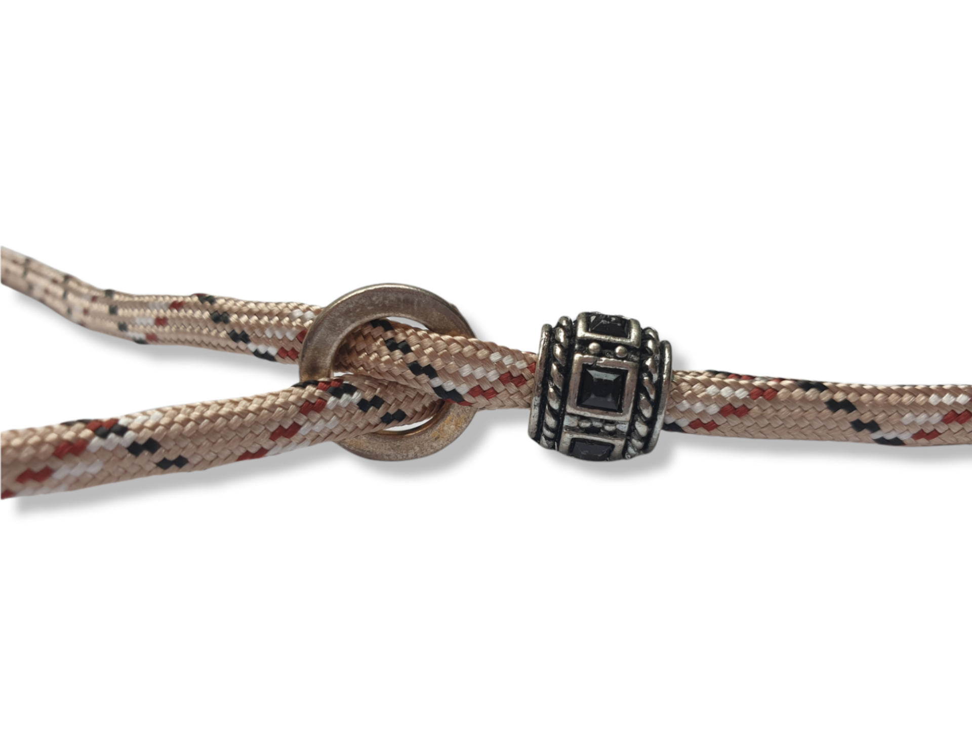 Het ringetje sluit aan in de nek en de kraal voorkomt dat de lijn open schuift.