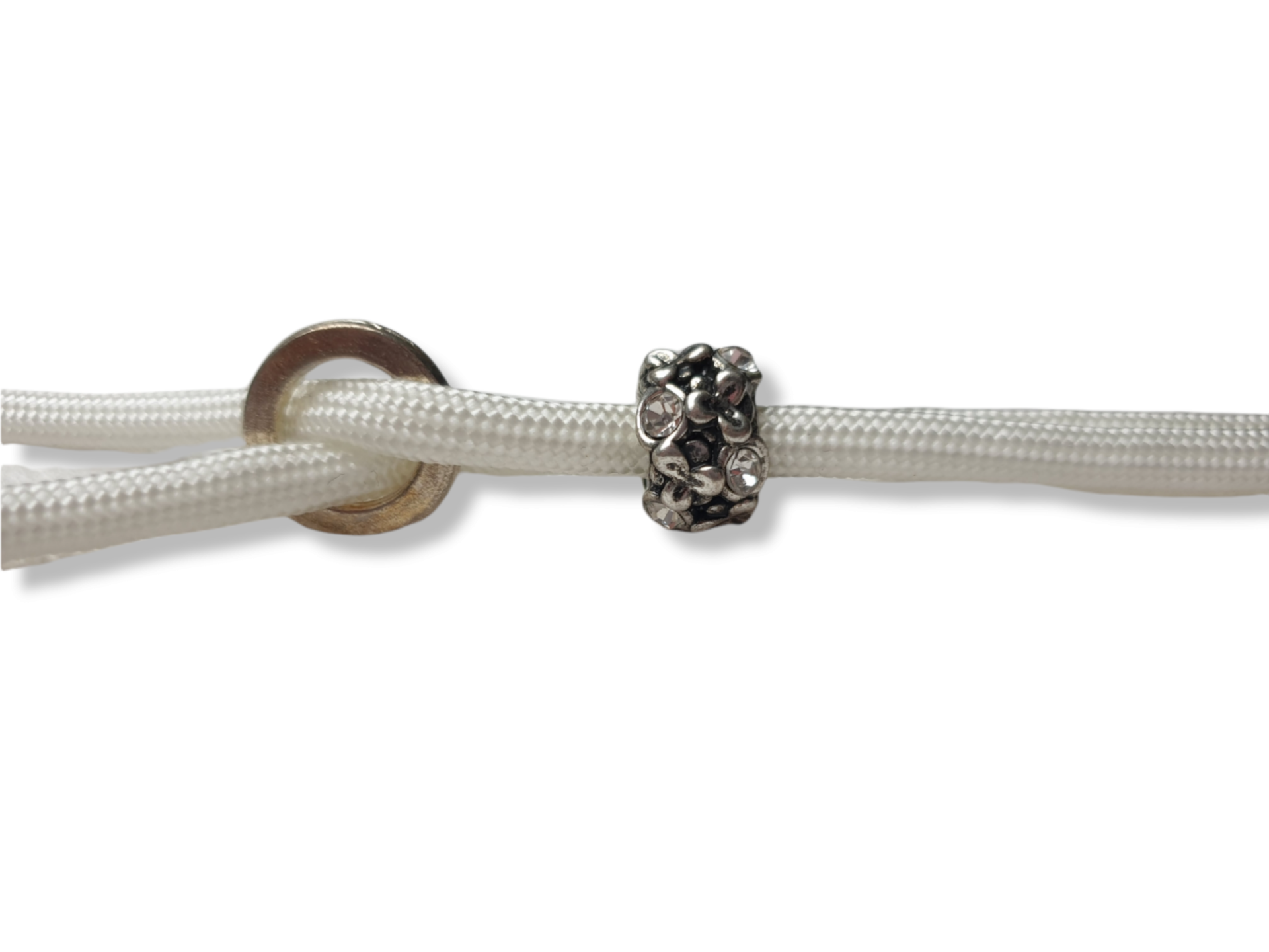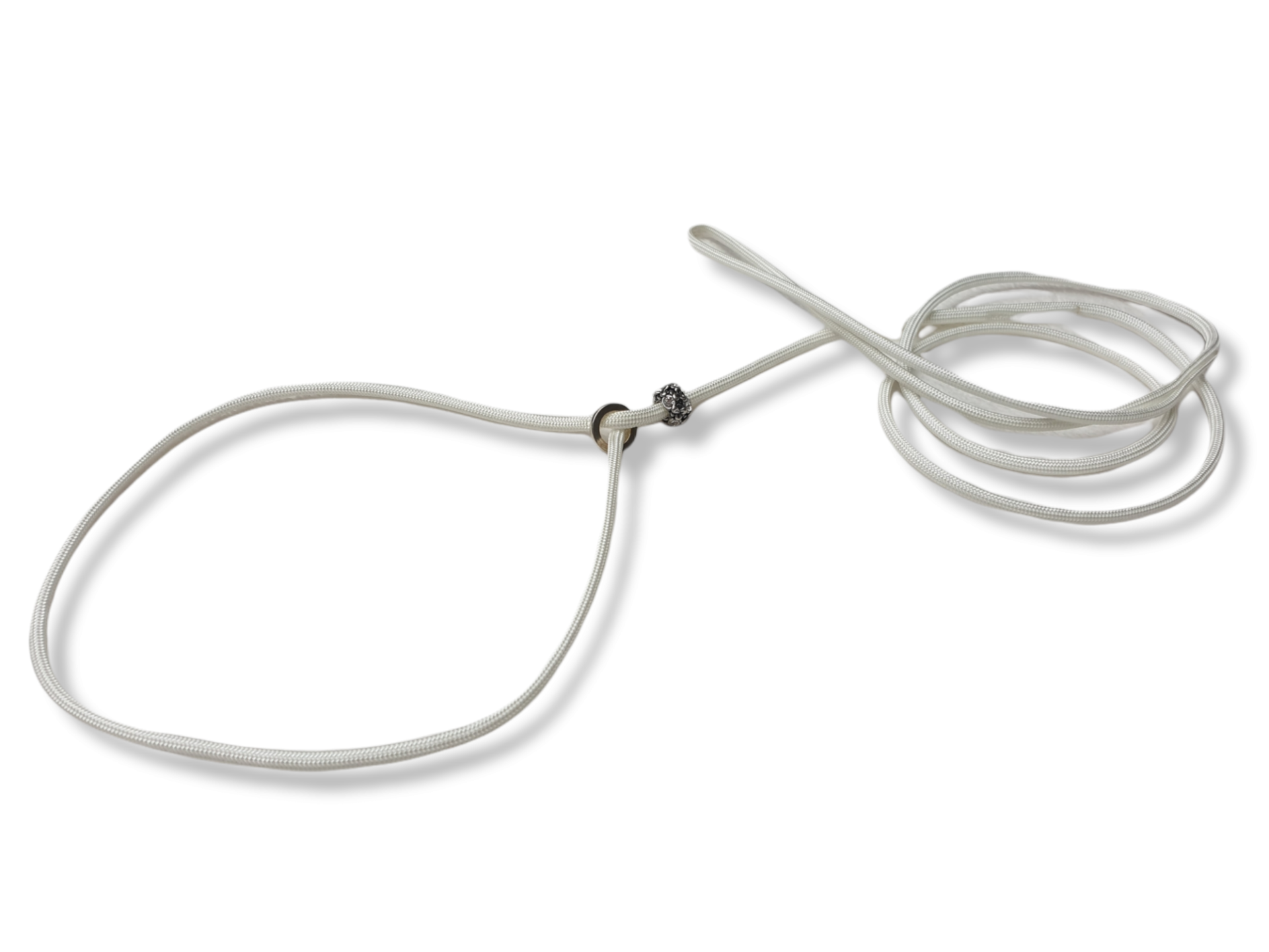 Het ringetje sluit aan in de nek en de kraal voorkomt dat de lijn open schuift.