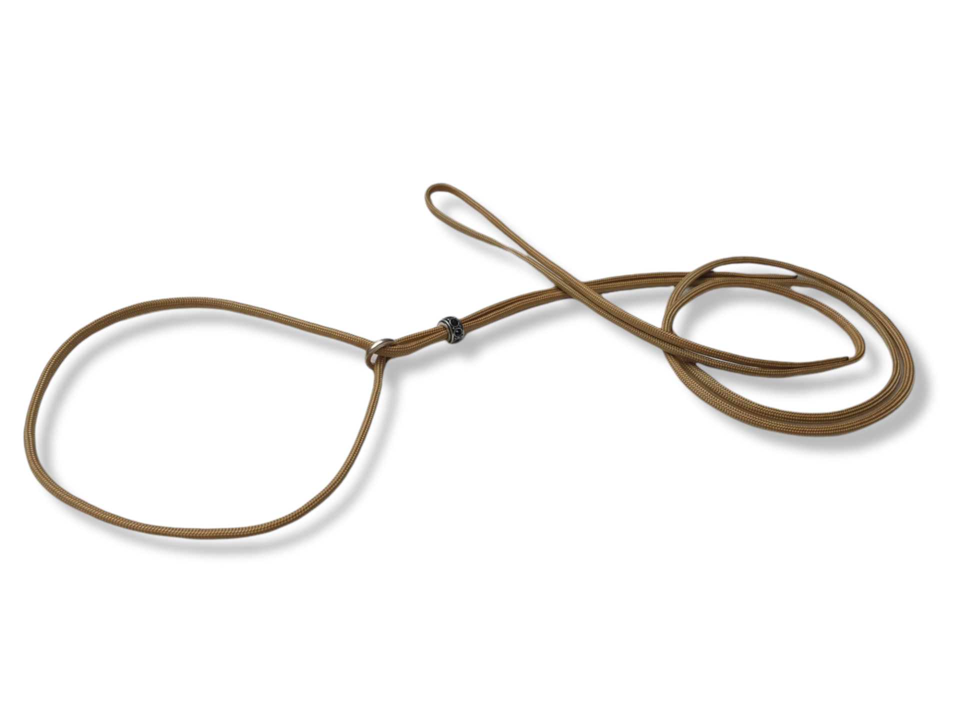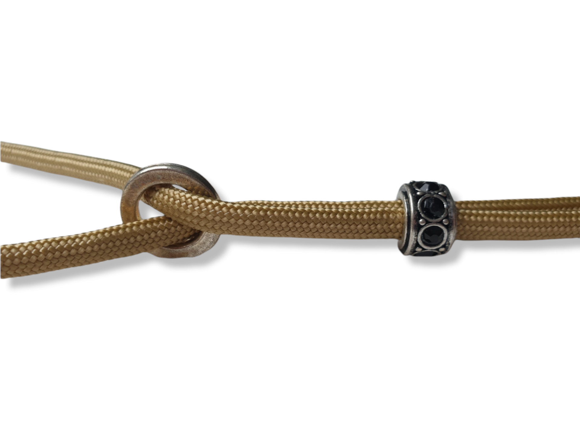 Het ringetje sluit aan in de nek en de kraal voorkomt dat de lijn open schuift.