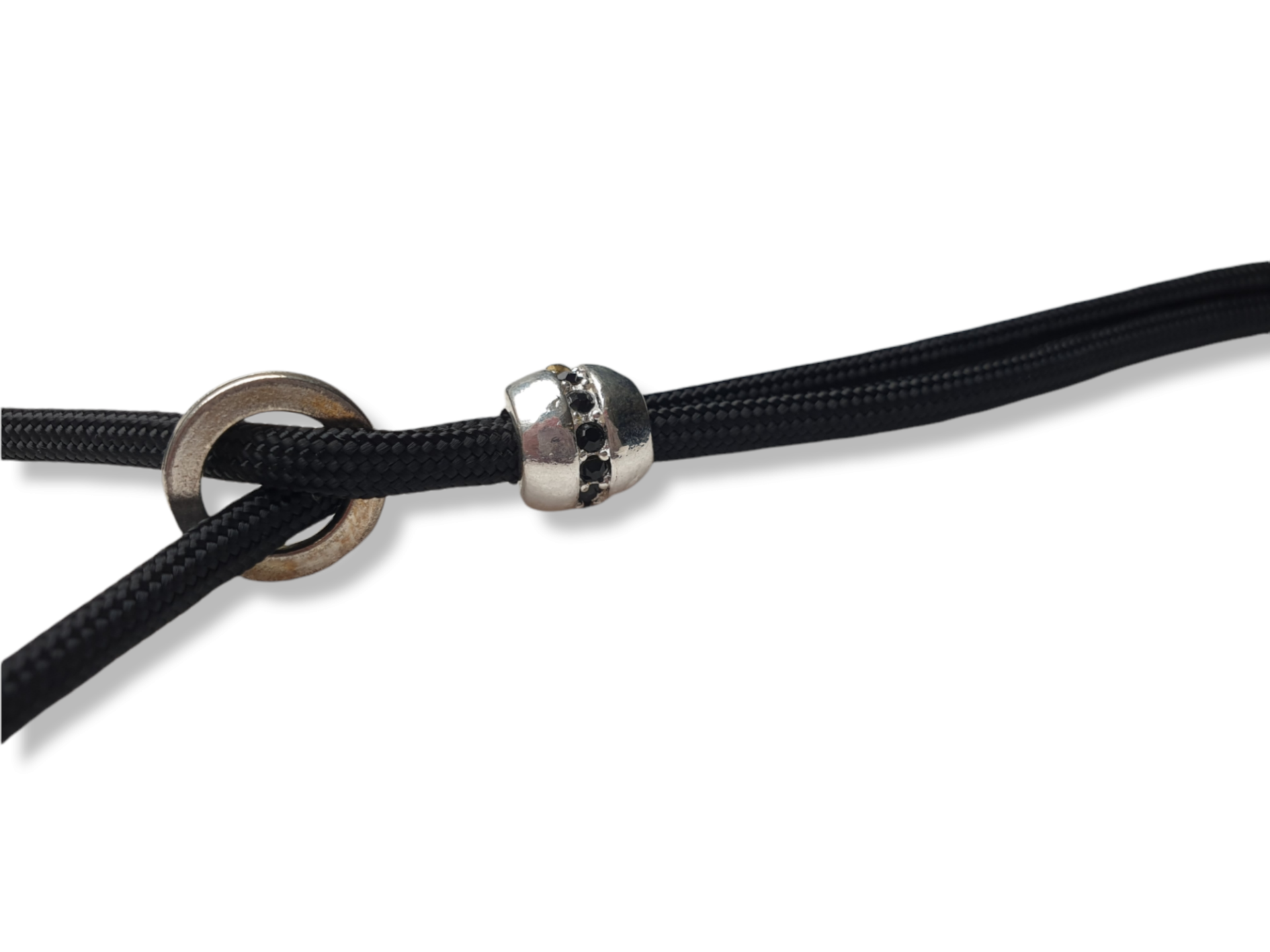 Het ringetje sluit aan in de nek en de kraal voorkomt dat de lijn open schuift.