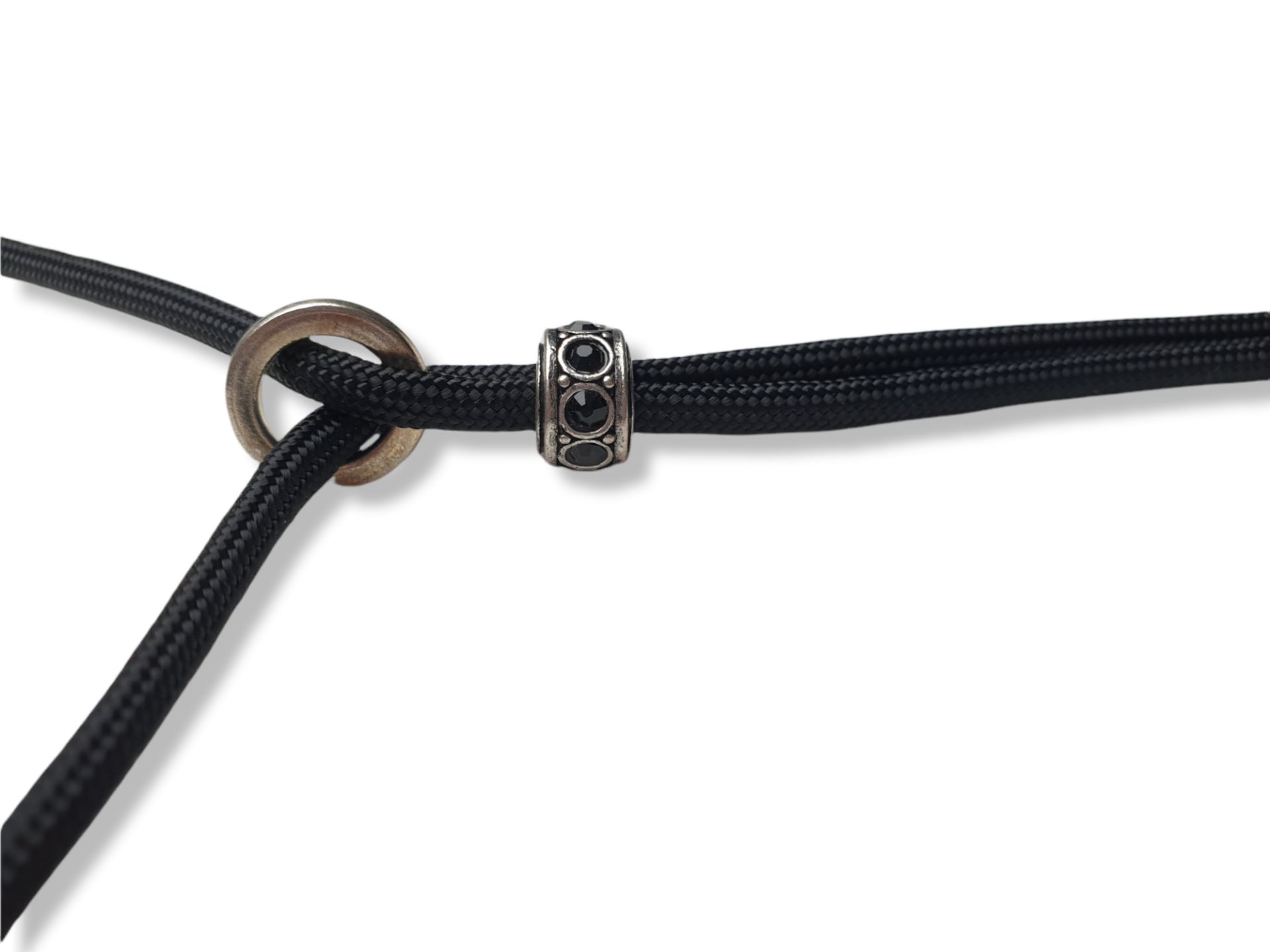Het ringetje sluit aan in de nek en de kraal voorkomt dat de lijn open schuift.