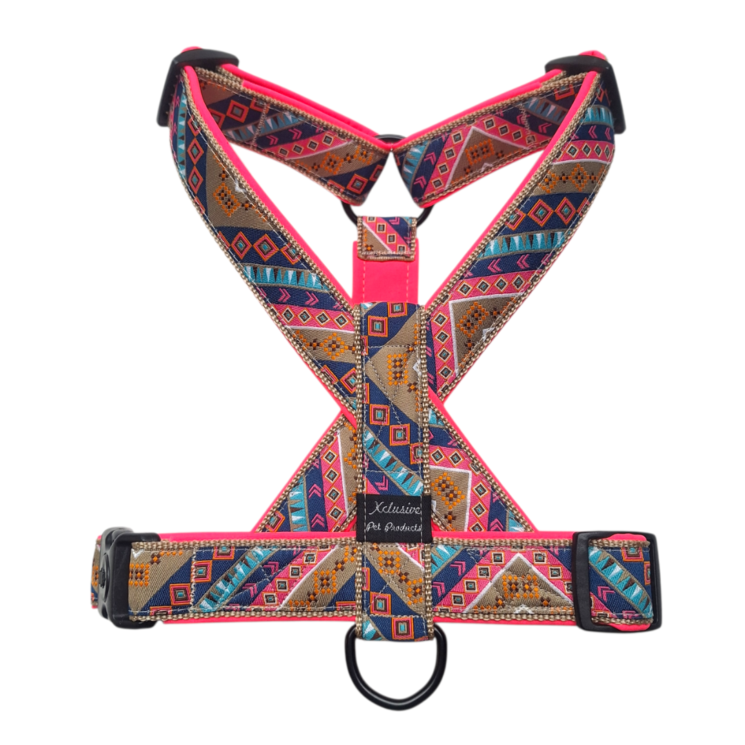 Dit volledig gevoerde tuig van ca 30mm breed heeft een verstelbare hals van 50-75 cm en een verstelbare buikband van 45-65 cm. Kijk bij de meetinstructie hoe je je hond dient op te meten om de juiste maat te bepalen.