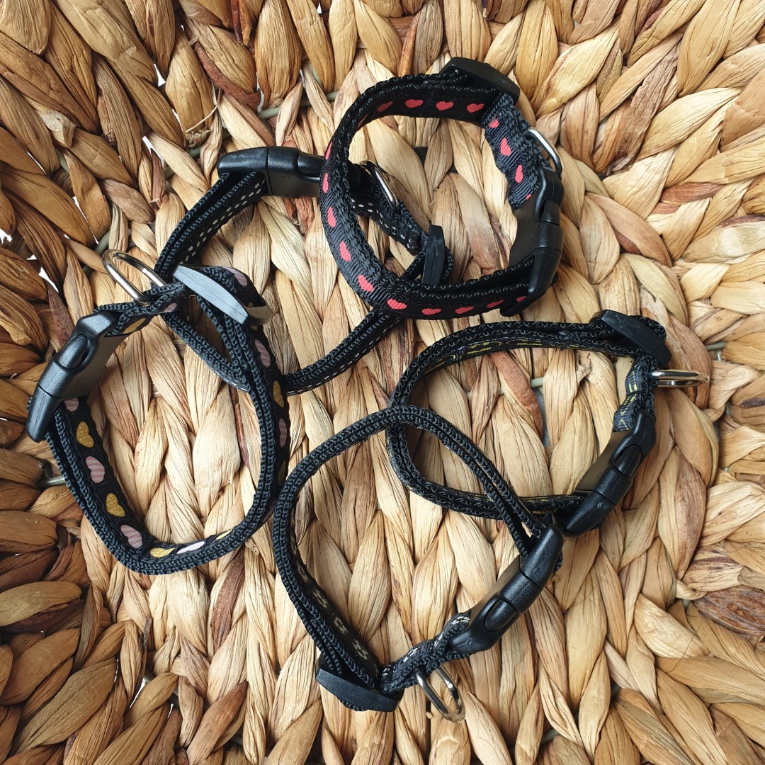 De halsbandjes zijn 15mm breed, verstelbaar van circa 22-35cm en zijn voorzien van een d-ring om mee te wandelen.