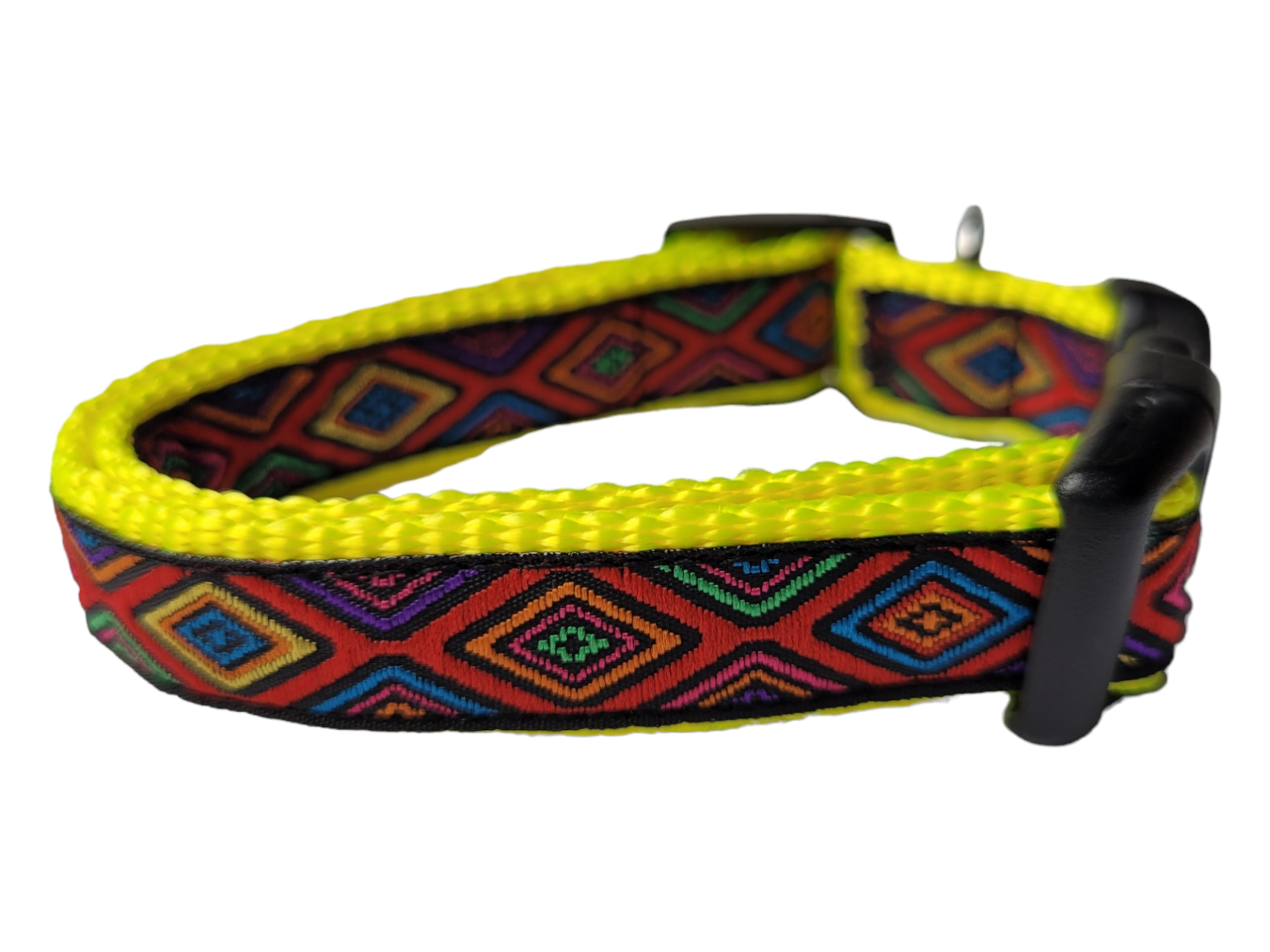 De halsbandjes zijn 15mm breed en verstelbaar van circa 22-35cm in maat M. De halsbandjes zijn gemaakt van stevig maar zacht band met een geweven printje wat deze halsband erg duurzaam en slijtvast maakt.