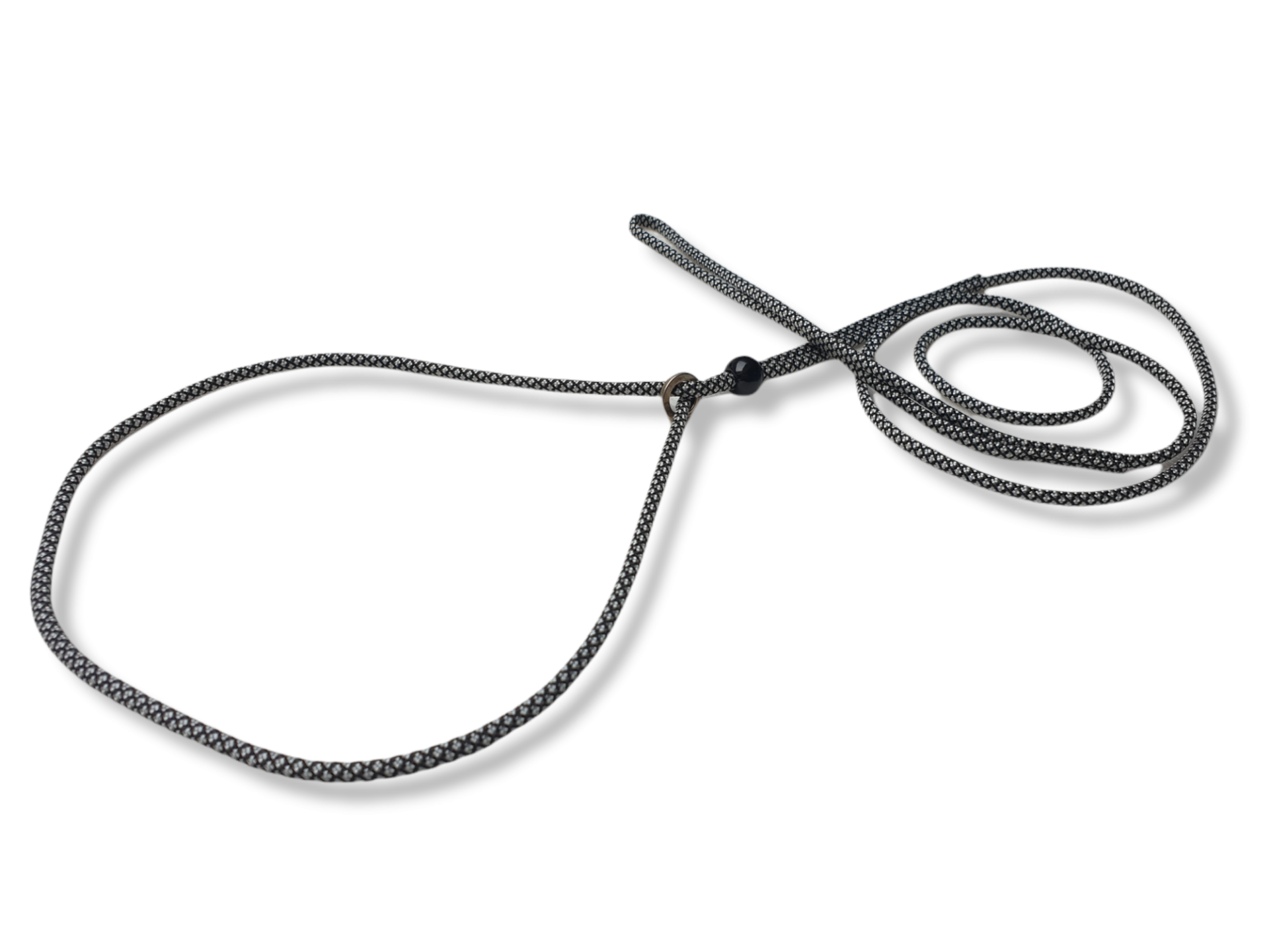 Het ringetje sluit aan in de nek en de kraal voorkomt dat de lijn open schuift.