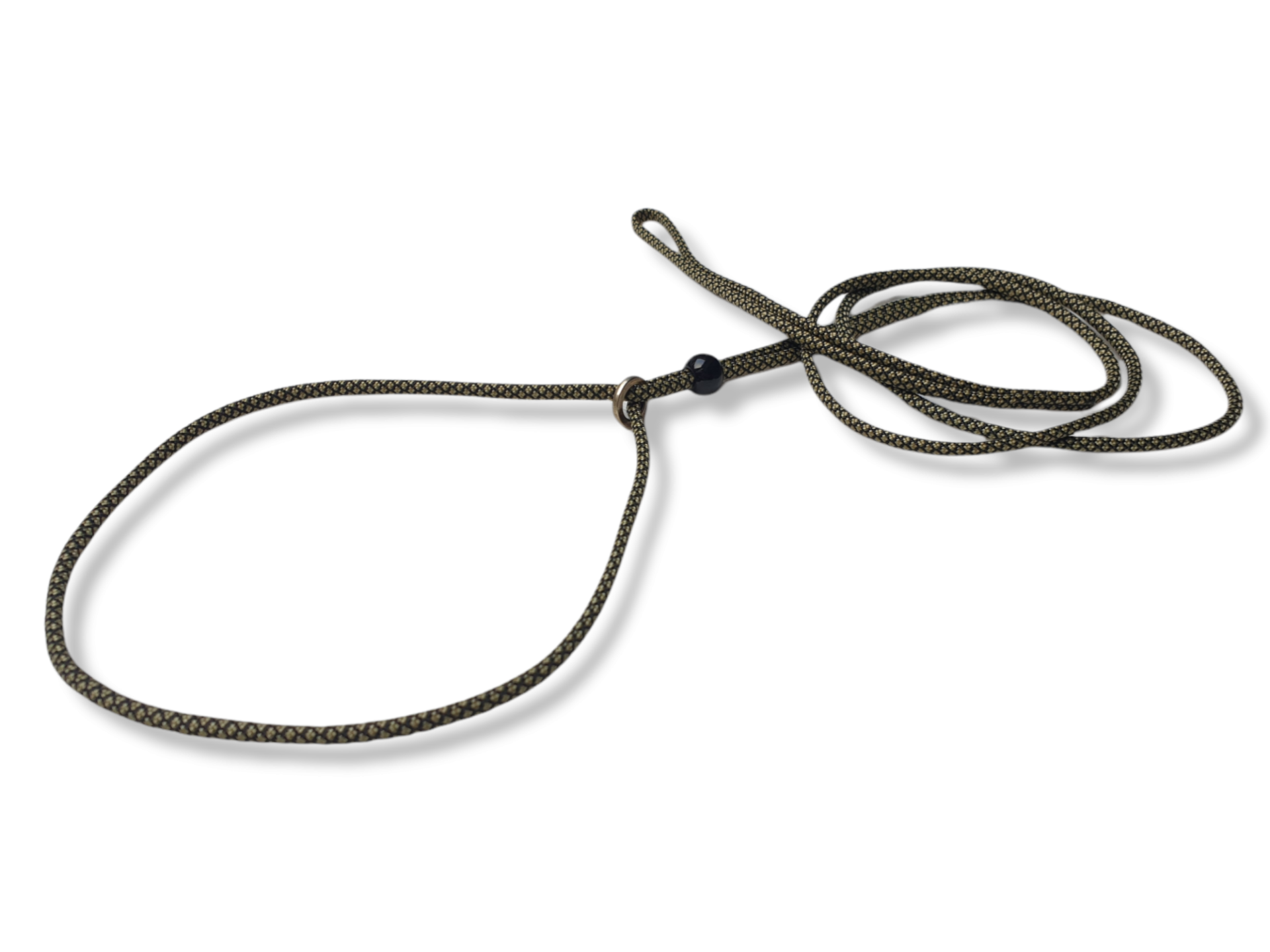 Het ringetje sluit aan in de nek en de kraal voorkomt dat de lijn open schuift.