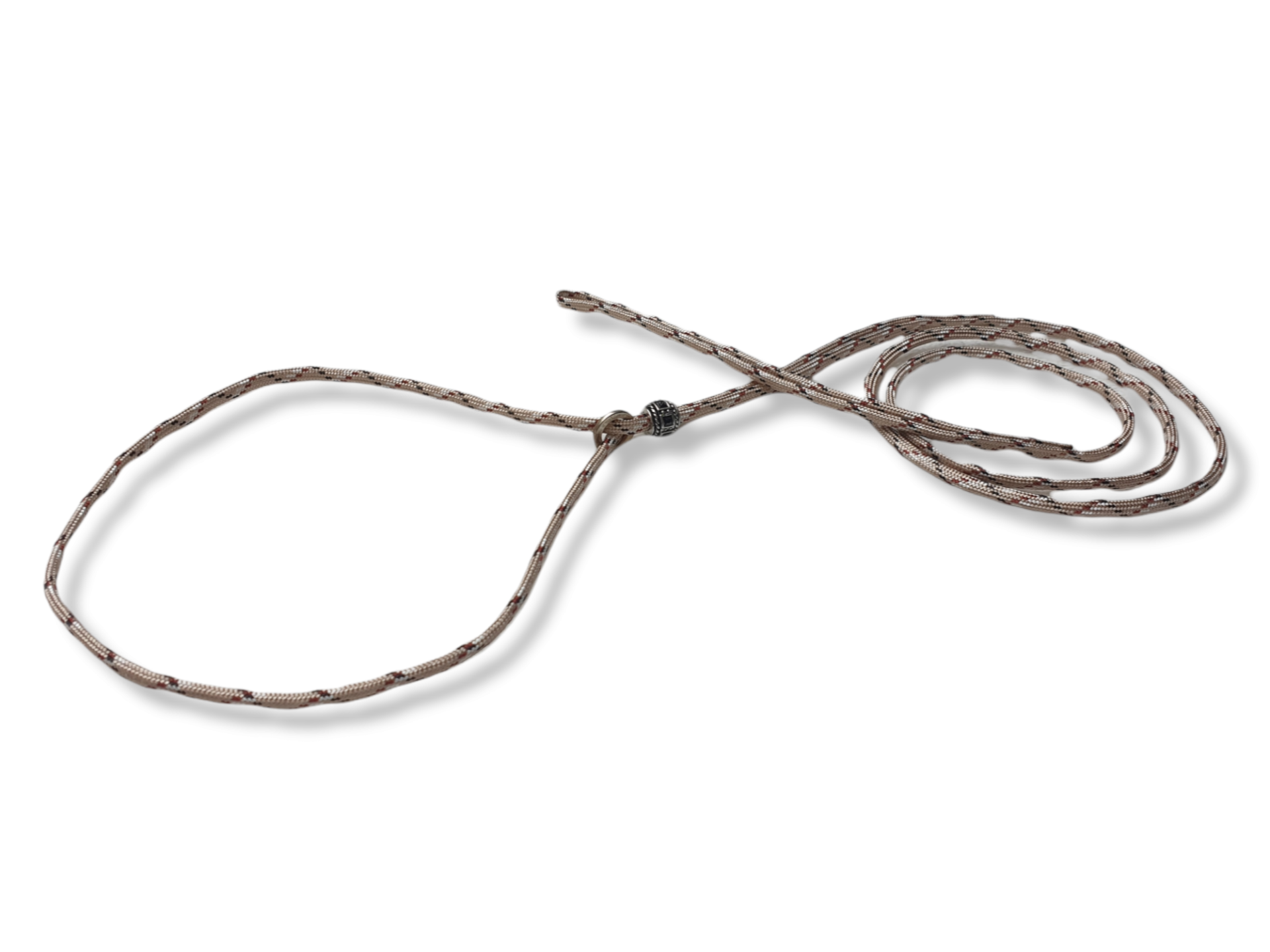 Het ringetje sluit aan in de nek en de kraal voorkomt dat de lijn open schuift.