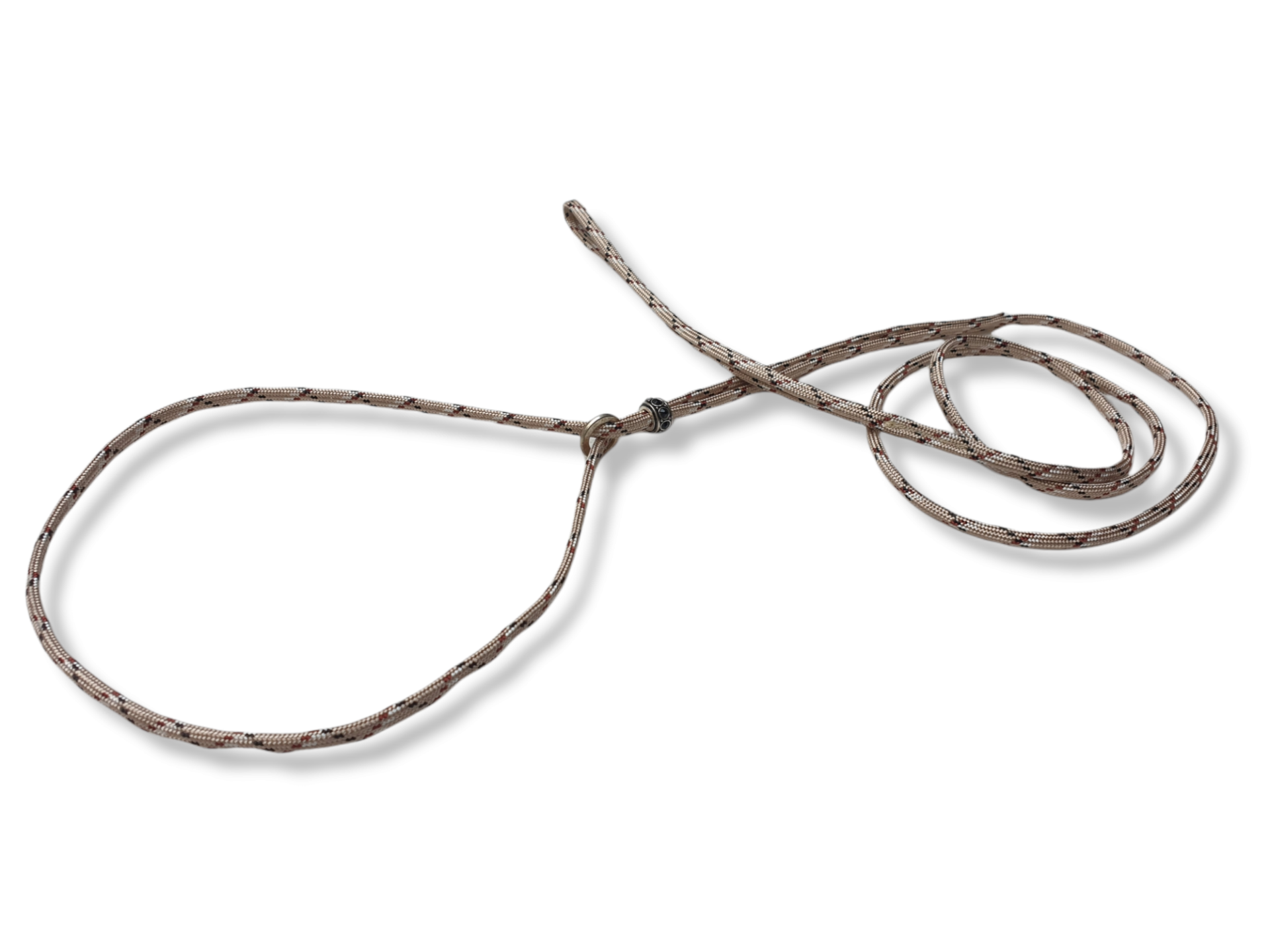 Het ringetje sluit aan in de nek en de kraal voorkomt dat de lijn open schuift.