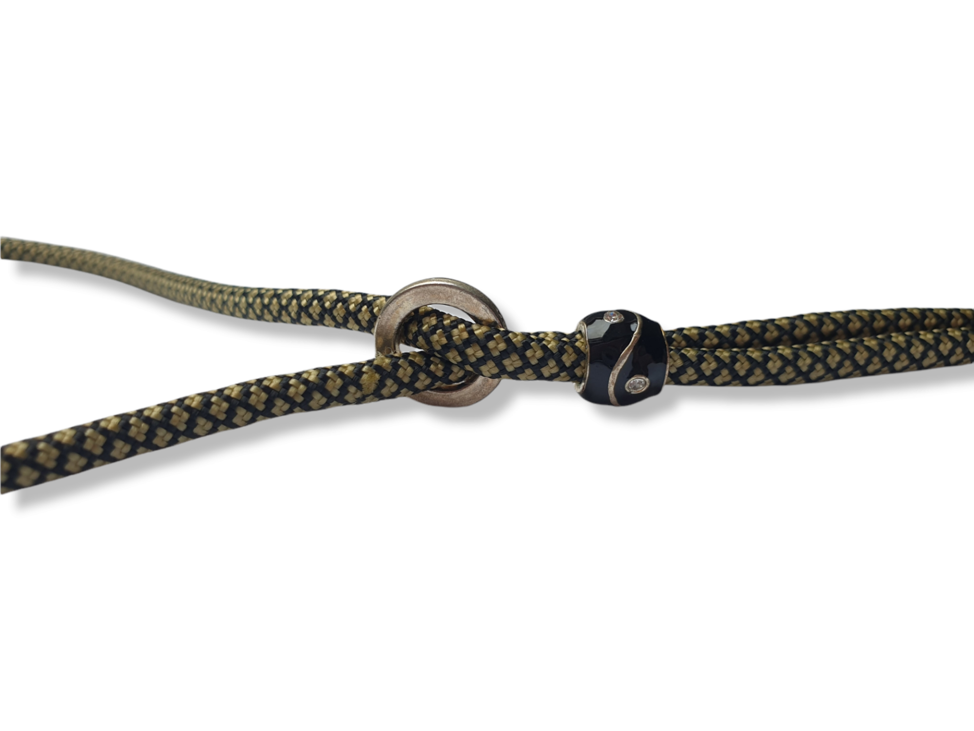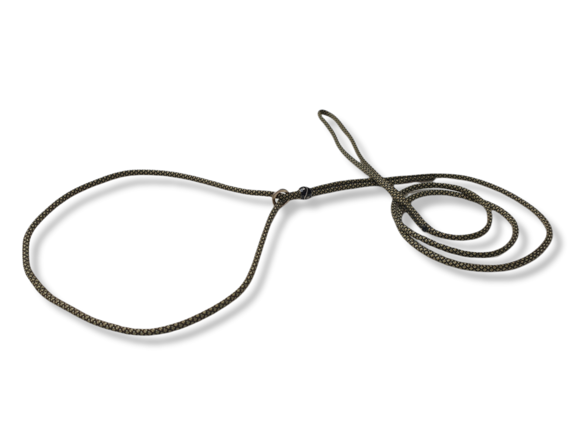 Het ringetje sluit aan in de nek en de kraal voorkomt dat de lijn open schuift.