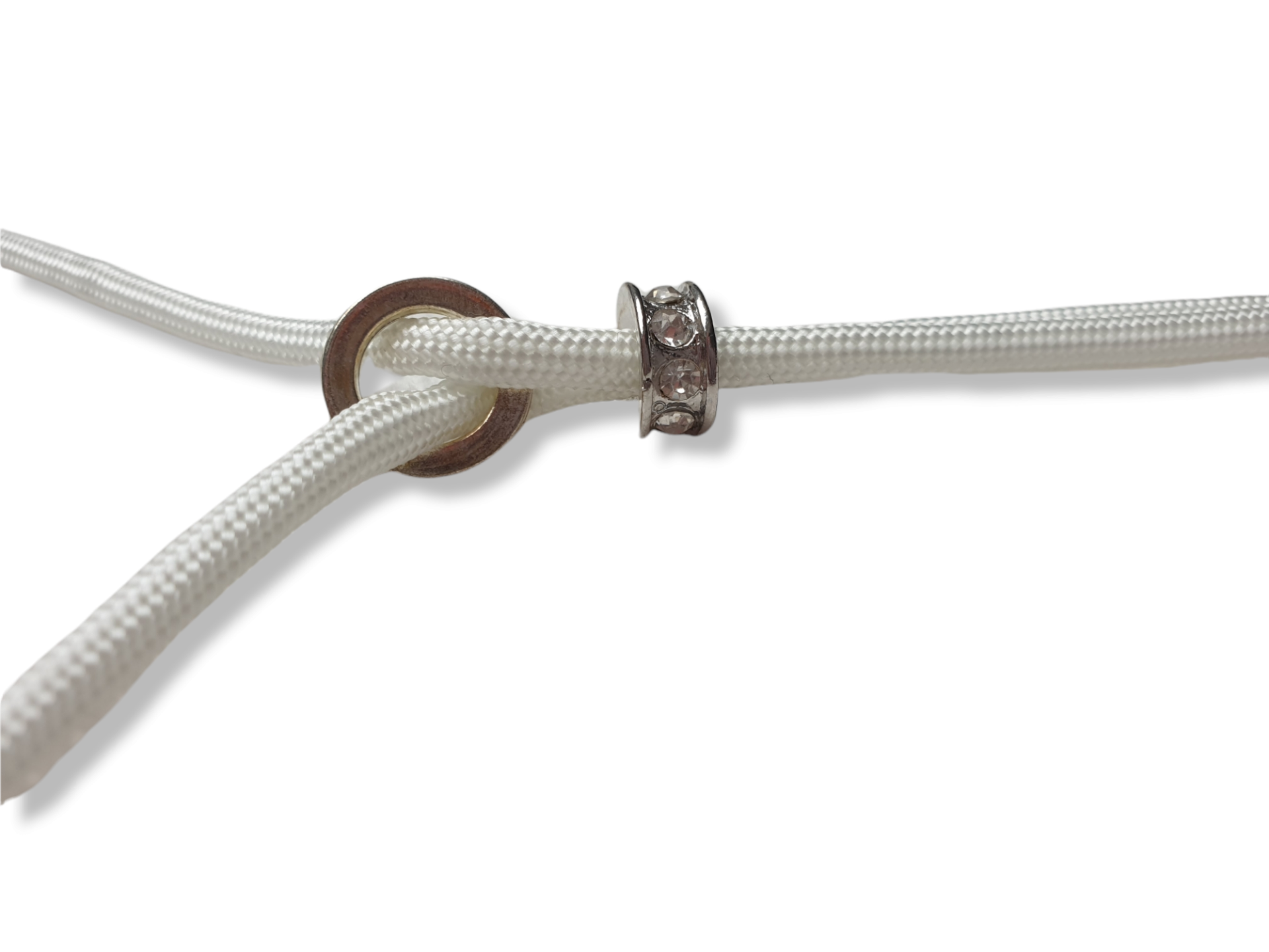 Het ringetje sluit aan in de nek en de kraal voorkomt dat de lijn open schuift.