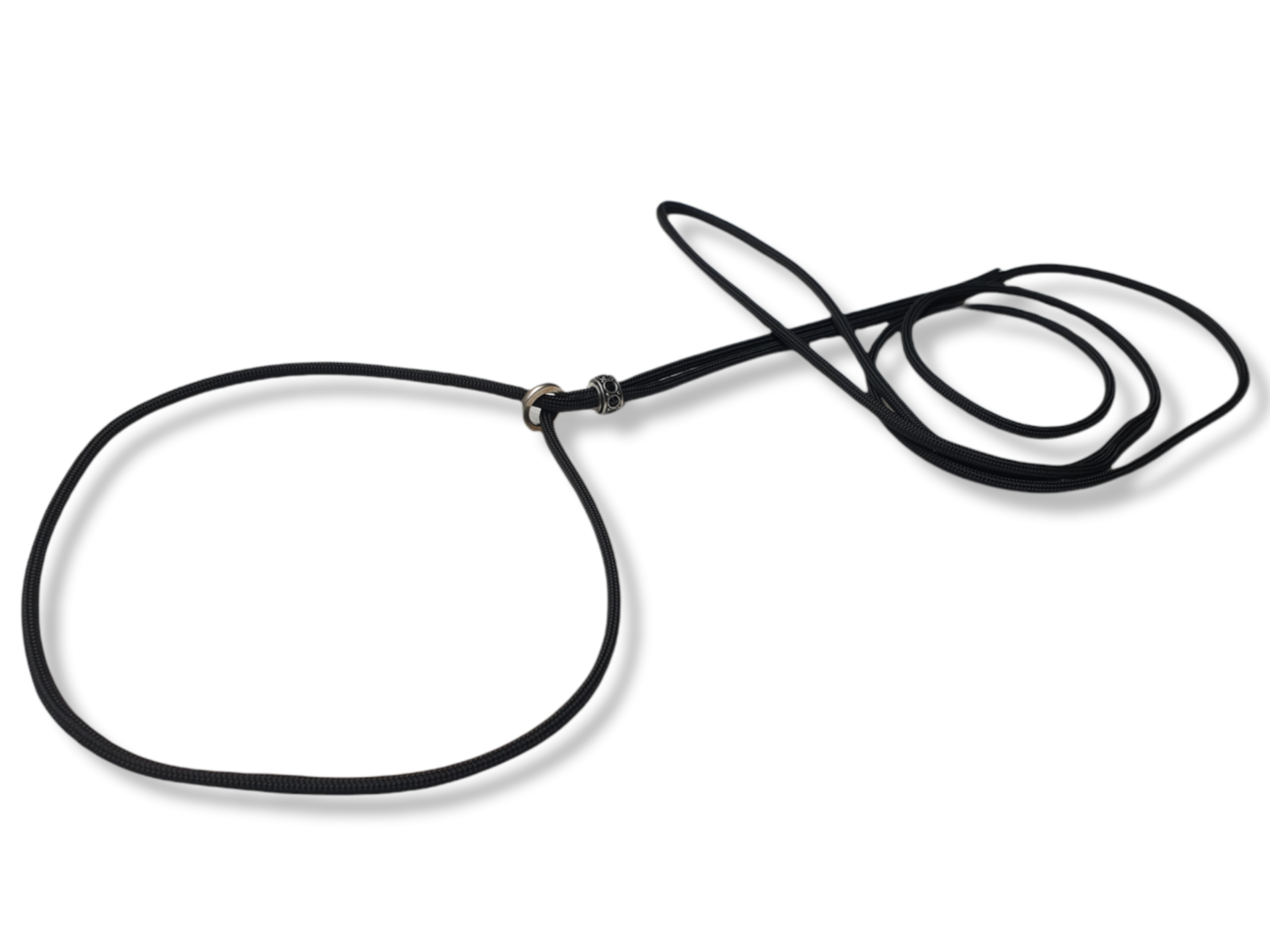 Het ringetje sluit aan in de nek en de kraal voorkomt dat de lijn open schuift.
