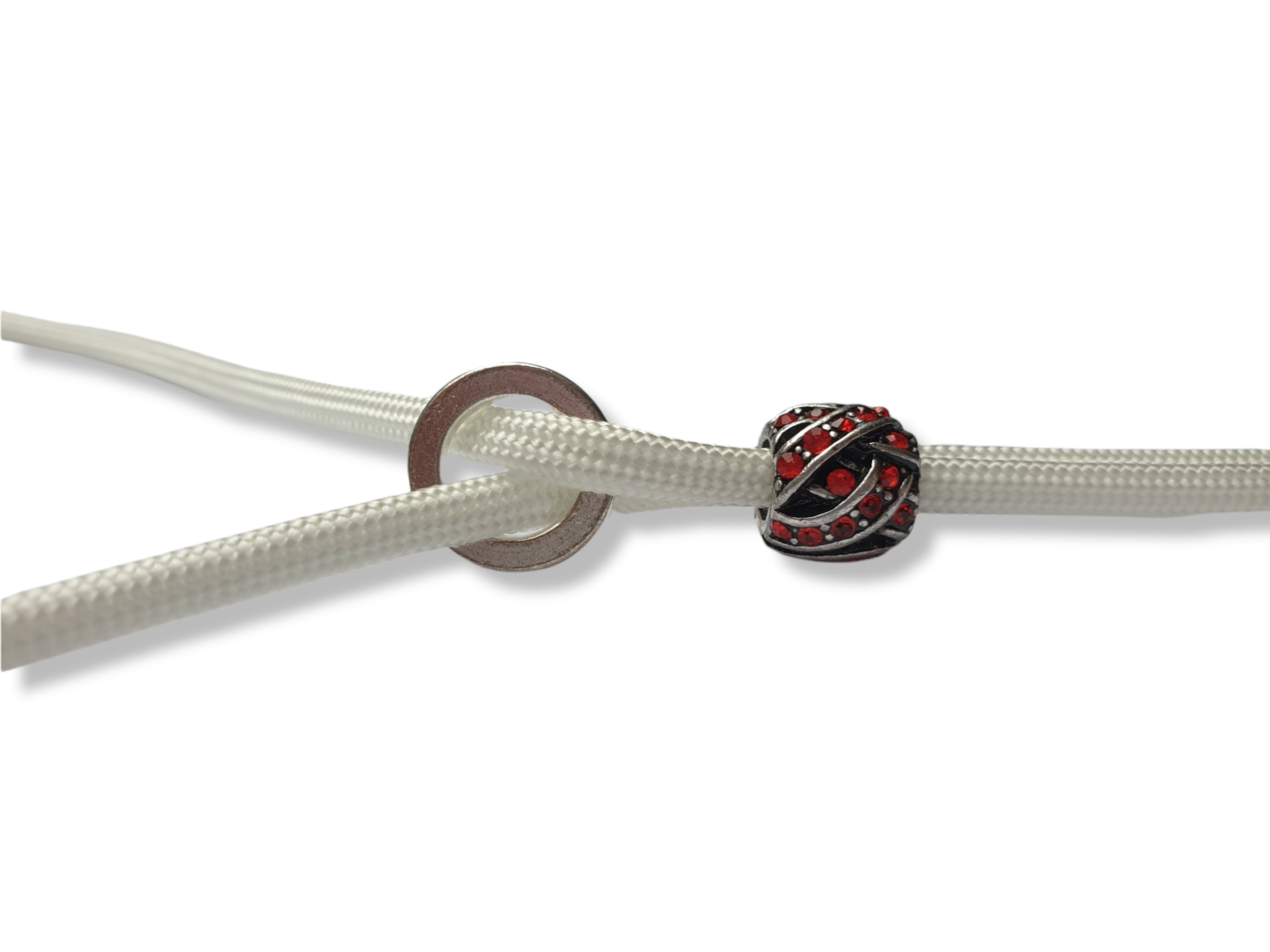 Het ringetje sluit aan in de nek en de kraal voorkomt dat de lijn open schuift.